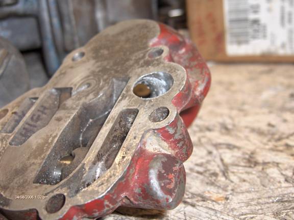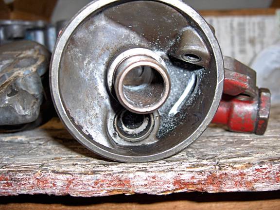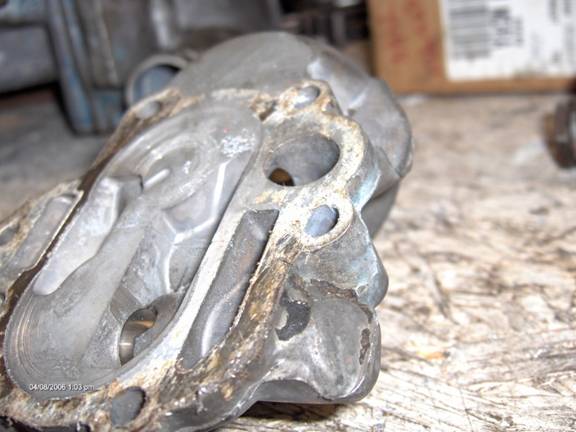 Now, the oil filter adapter. Oil leaves the pump and enters the adapter through the rectangular slot at the left in the picture. Oil leaves the adapter and back into the cover through the round discharge hole (with the arrow inside) at the right. Not much to see from this top angle except where I enlarged the hole on the right to 17/32. Be very careful as the filter bypass spring is at the bottom of this hole, stop before you get there. You will want to smooth out this hole with a bur where it intersects with another (shown later). Also the astute observer will notice that I got a little carried away and poked through the casting, in the relieved area near the discharge hole. I got a little greedy on my 1970 casting. The next photo shows a later casting (1976) which is different in this area; it has more meat.