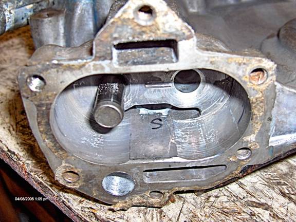 The next photo shows the gear pocket, the front cover is lying with the engine side down. The photo shows the gear pocket and pump inlet (just above the S). This is the other end (after a 90 deg turn) of the S inlet passage mentioned above. I just smoothed the 90 deg turns with a bur, trying not to enlarge it any in the downward (towards you) direction. The photo doesnt show it, but there is room at the top of the passage to enlarge it slightly upwards.