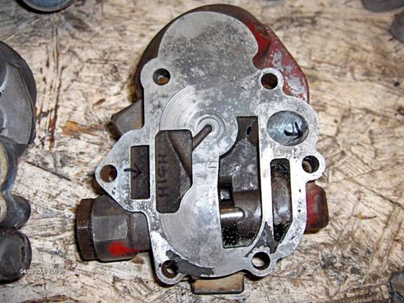 A word on oil booster plates. This is a photo of my Melling P-20I plate. In addition to a new wear surface for the gears, it increases the efficiency of the pump by decreasing the pumping losses. It works like this: it closes off the relieved area of the adapter, on which the gears ride as they turn, carrying oil from the low pressure side around to the high pressure side. In the photo, you might be able to make out the low and high written in the relieved areas. The gear on the left turns counterclockwise, the right gear turns clockwise. In the relieved area, any oil that the gears are trying to compress squirts back down into the suction (low pressure) area, instead of being carried on around. Only where the area is completely closed off can the pump develop pressure and move oil. You can see from the pic of the stock adapter that the left gear turns about halfway through a revolution that is useful. The right gear about ¼ of a turn. The booster plate closes off these relieved areas so that more of the oil is carried around by the gears and is not wasted. Now looking at the gear pocket in the front cover, youll see that the gears are not completely surrounded plus at the top there is an area where it is also open, so the plate only helps out on the filter adapters inefficiencies, but it helps. Make sure the bigger round hole in the booster plate as well as the oval slot at the bottom do not obstruct flow in either the adapter or the cover; you might have to port match. The round hole measured .600, the slot needed a little clearancing at the corners to fit mine. The larger oval slot is to allow excess oil from the pressure relief valve to be allowed back into the suction side.