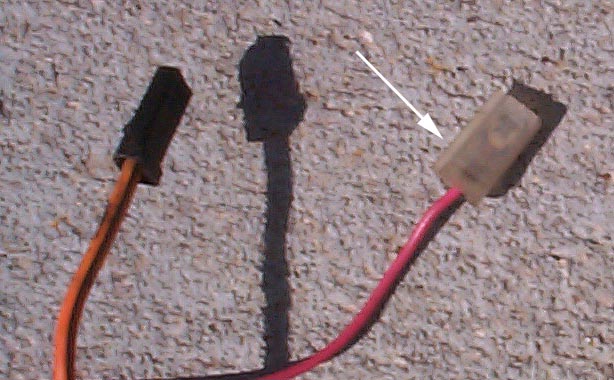 Notice the white arrow pointing to the master power wire tang. This