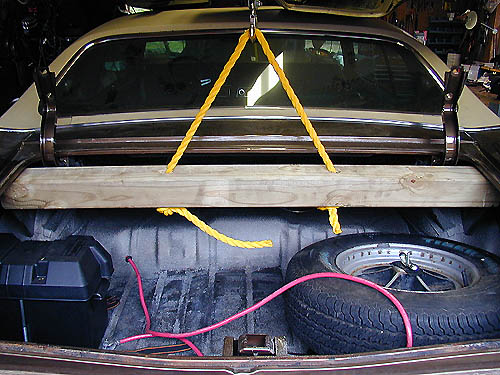 To actually separate body and frame, I started with the frame up on 4 jack stands. I removed the body bushing bolts; an air impact and PB blaster loosened the bolts easily. I took a piece of 4 x 4 and cut it to fit between the trunk supports that run on a diagonal upward from front to rear just under the front lip of the trunk opening. I drilled the 4 x 4 with 1" holes about 18" from the ends (not a real important number, just keep it even for balance). I then got some ¾" poly pro rope from the hardware store (6') and inserted the ends in the holes and put a knot in the ends. To this, I hooked a come-a-long and hooked the other end to the central beam in my shop. I jacked it up while keeping the 4 x 4 as far forward as possible, holding it up against the trunk hinges until it lifted up off the frame(see picture two).