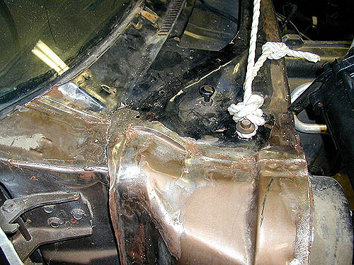 For the front, I used the rear most upper front fender-mounting bolt. It is the one that is on the cowl itself about 8" forward of the door hinges and 4" toward the center of the car. I tied some ½" poly pro, like you tie a hook on a fishing line (called a surveyors knot) around the fender bolts under the washers (see picture three).