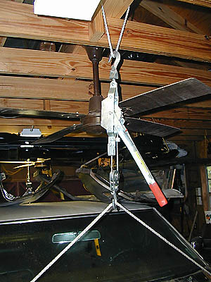 I did this for two reasons, it made the body much more secure with no swinging at all, and I didn't want to rely on the bolts and ½" rope to support the body for that length of time. Be sure that you lift the body up high enough so that you can slide the frame back under it and put the jack stands wide enough so that the frame can clear them when you push it back under there (this is if you have to store the frame under the car for lack of room). As a warning I work with knots all the time and trust my life to my knots. I also know that ½" poly line has a working strength of over 1,000 pounds so I am completely comfortable with my rigging. You may knot be (I couldn't resist). So, chains can be used in place of the rope. It is about $2.00/ft more than the ¾' poly rope, but if you are unsure of your knot tying ability, use chain. If you use chain, I would bolt the chain to the rear 4 x 4 with class 5 or better hardware so the 4 x 4 stays flat. I first tied the ropes to it and the 4 x 4 rolled, and the edge of the 4 x 4 had the weight and wasn't spreading it out on the trunk edge. Your choice. Obviously use chain that the front fender bolts will go into, and if the bolts are not in good shape, use class 5 or better. Also, don't EVER get under anything that does not have proper jack stand support under it. You can also get away with only one come-a-long by come-a-longing the rear up and securing chain or rope between the ceiling beam and the chain or rope on the 4 x 4. Then lower the come-a-long until the weight is off of it and unhook it and move it to the front. You could also use an engine hoist in place of the come-a-long if you are using the ceiling beam. If you are outside or don't have a beam, then two engine hoists would be needed, one for each end. I like the little caster deal since it is so easy to roll it in and out and I can lift my frame onto saw horses and work on it at hip level or flip it on its side. Use swivel casters on the rear 2 x 4 and regular casters on the front. This is easier that it sounds. It is nice to have another set of hands to help with the 4 x 4's but not absolutely necessary.