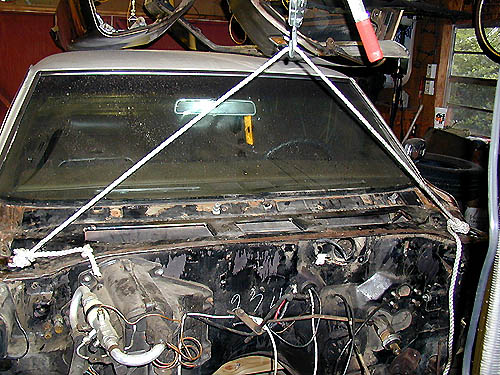 I screwed the fender bolts all the way in and hooked a come-a-long to the rope and hooked the other end to the shop beam and lifted the front of the body clear of the frame (see pictures four and five).
