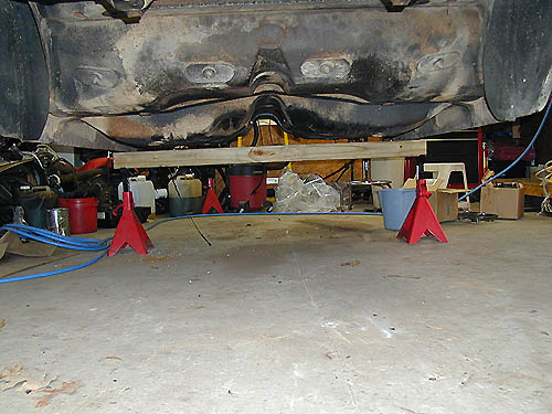 I then took another 4 x 4 that fit across the rear frame rails where the gas tank goes and jacked the frame up, removed the rear jack stands, and lowered the frame to the ground. I went to the front and jacked the frame up from under the front cross member and removed the jack stands and lowered the frame to the ground. I rolled the frame out of the shop. Then I took another 4 x 4 that was cut to stick out from either rocker panel 6" and put it under the front rocker about even with the door hinges and supported it with the jack stands and lowered the front come-a-long down until the body rested across the 4 x 4 (see picture 6).