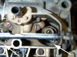 A couple of other problems but not common are the carb being bolted to the intake with excessive torque and fuel well plugs leaking. If the carb is overtightened with the four bolts mounting it to the intake the air horn will be bent creating fuel leaks and vacuum leaks. Always change the base gasket when installing a rebuilt carb for it to create an air-tight seal between the carb and intake. The fuel well plugs can leak and the best way to fix them is to use an epoxy to seal both wells. The wells are located under the bottom of the fuel metering rods.