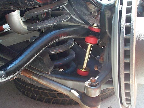 If the brackets are too much hassle to remove, JC Whitney carries new brackets with polyurethane bushings for $10/pr, part #74FG8536W. If you managed to get the brackets, you can purchase new bushings in either rubber or polyurethane at most local auto parts stores for $5-10. It is also a good idea to get polyurethane end link kits since polyurethane deflects less under load. You can get new poly bushings with brackets from Autozone, endlink kits are polyurethane, Perfect Circle, # SL72HD or use Energy Suspension mounts 9.5165R and endlink kits (w/2 5/8" spacer) 9.8117R