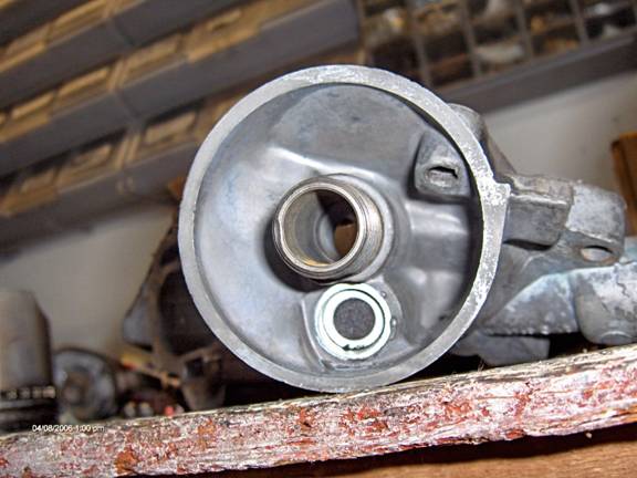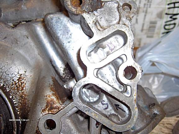 The next photo shows the gear pocket, the front cover is lying with the engine side down. The photo shows the gear pocket and pump inlet (just above the S). This is the other end (after a 90 deg turn) of the S inlet passage mentioned above. I just smoothed the 90 deg turns with a bur, trying not to enlarge it any in the downward (towards you) direction. The photo doesnt show it, but there is room at the top of the passage to enlarge it slightly upwards.