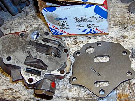 A word on oil booster plates. This is a photo of my Melling P-20I plate. In addition to a new wear surface for the gears, it increases the efficiency of the pump by decreasing the pumping losses. It works like this: it closes off the relieved area of the adapter, on which the gears ride as they turn, carrying oil from the low pressure side around to the high pressure side. In the photo, you might be able to make out the low and high written in the relieved areas. The gear on the left turns counterclockwise, the right gear turns clockwise. In the relieved area, any oil that the gears are trying to compress squirts back down into the suction (low pressure) area, instead of being carried on around. Only where the area is completely closed off can the pump develop pressure and move oil. You can see from the pic of the stock adapter that the left gear turns about halfway through a revolution that is useful. The right gear about ¼ of a turn. The booster plate closes off these relieved areas so that more of the oil is carried around by the gears and is not wasted. Now looking at the gear pocket in the front cover, youll see that the gears are not completely surrounded plus at the top there is an area where it is also open, so the plate only helps out on the filter adapters inefficiencies, but it helps. Make sure the bigger round hole in the booster plate as well as the oval slot at the bottom do not obstruct flow in either the adapter or the cover; you might have to port match. The round hole measured .600, the slot needed a little clearancing at the corners to fit mine. The larger oval slot is to allow excess oil from the pressure relief valve to be allowed back into the suction side.