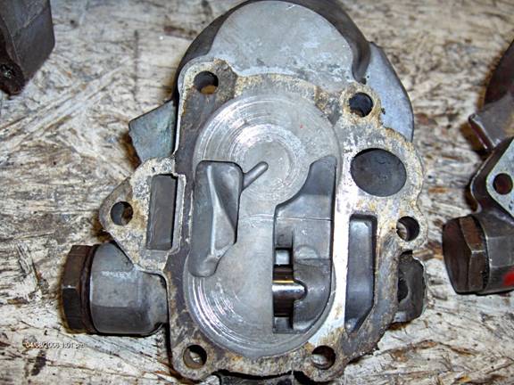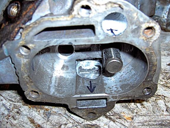Now, the oil filter adapter. Oil leaves the pump and enters the adapter through the rectangular slot at the left in the picture. Oil leaves the adapter and back into the cover through the round discharge hole (with the arrow inside) at the right. Not much to see from this top angle except where I enlarged the hole on the right to 17/32. Be very careful as the filter bypass spring is at the bottom of this hole, stop before you get there. You will want to smooth out this hole with a bur where it intersects with another (shown later). Also the astute observer will notice that I got a little carried away and poked through the casting, in the relieved area near the discharge hole. I got a little greedy on my 1970 casting. The next photo shows a later casting (1976) which is different in this area; it has more meat.