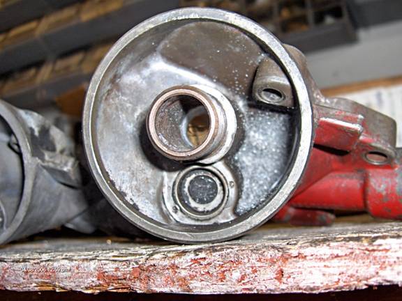 First, the front timing cover. The first photo (above) is of the backside of the front cover, with the pump downwards and the distributor hole upwards. The photo shows the suction (pump inlet, or S) passage at the bottom and discharge (pump outlet, or D) passage near the top. Here I used a carbide bur to smooth the rough edges where the passages make 90 degree turns to go down to the pump. In the discharge passage facing you, I ran a ½ drill bit in it to open it up a little; if you do this be sure to center the bit as it will try to walk and eat into the gasket sealing surfaces.