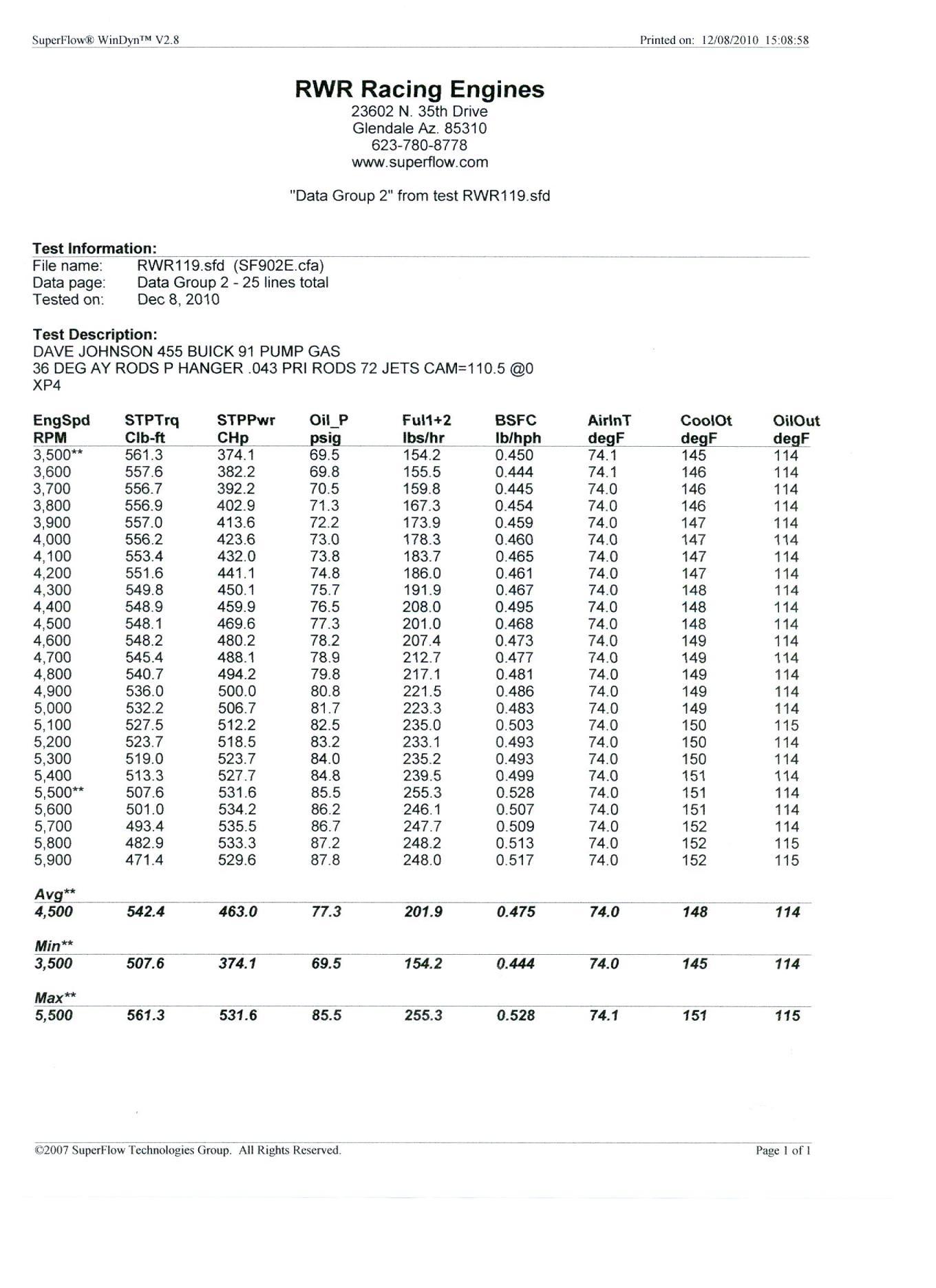 I was fortunate enough to be able to spend a day tuning a 455 Buick on a dyno and learned some interesting things. I was under the assumption that the lower letter hanger and thinner rods would indeed build more power as I've always heard our Buicks like lots of carb and fuel. WRONG. The engine we dyno'd was a 500 horse mild street engine that runs on 91 pump gas. The best power was made with a P hanger and AY rods which is a .057" tip. The P hanger has a height dimension of .590". The B hanger has a height dimension of .525". We started with a H hanger and went richer (smaller letter) and then worked out way up in hangers till we found the best power. Same with the secondary rods. We tried CC (.0303" tip), BG (.0400" tip), AX (.0400" tip but different A & B steps), CE (.0413" tip), AU (.0530" tip, which is stock Stage 1), AY (.0570" tip, which turned out to be the best), BT (.0600" tip) and CL (.0670" tip). Now this engine had the factory cast iron exhaust manifolds that were ported by Greg Gessler. We thought that we'd pick up power especially on the top end with some headers, so we bolted on a set of Mickey Thompson equal length headers with the 1 7/8" primaries and 3 1/2" collectors. I think it picked up one horsepower and about 4 foot pounds of torque. We then bolted on a race prepped 750 Holley that was ported and flowed 940 cfm, no appreciable power gain. And its important to note that the 800 QJ that was built by a very respected Super Stock racer out of Calif. only picked up about 1 horsepower over a 750 QJ that we built ourselves. So don't buy into the hype of having to have an 800 QJ to build power, the stock 750 (1967 thru 1970) big block carb can and does build basically the same kind of power.