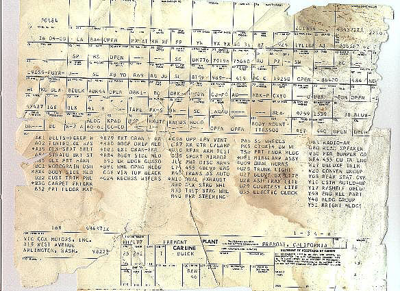 The Build Sheet tells what options came on a particular car from the factory and what dealer it was delivered to when it was new. It is usually located under the back seat bottom cushion. Sometimes they are also found on the back side of the driver's door panel or behind the driver's side kick panel. Below is an example from a 1971 GS.