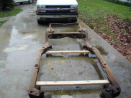To remove my body from the frame, I took out the engine, tranny, radiator, master cylinder, core support, steering box, front fenders, inner fenders, gas tank, hood all of this stuff was removed to either facilitate the 455 swap I'm doing or to repair rusty areas. Some of this does not need to be removed to separate body from frame. You can leave the steering gear and all suspension pieces on. I completely removed all the suspension pieces including rear axle and all wheels. This was to facilitate changing bushings. At this point, I decided to just go ahead and separate frame and body. All that was left connecting was the brake lines and the emergency brake cable. Most people leave the wheels on to roll the frame out. Since mine were already removed, I cut two pieces of 2 x 4 as wide as the frame. One I bolted to the holes the tranny cross member bolted to (one on each end), and the other I used 3" toggle bolts to bolt it to the 2" holes in the underside of the frame where it starts to go up over the rear axle. I got some 3" casters from Lowe's, which I bolted to the 2 x 4's. This facilitates me rolling the frame out from under the body. (see picture one)