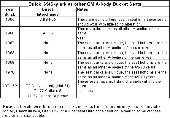 Below is a list of seats that will interchange with Buick GS/Skylark