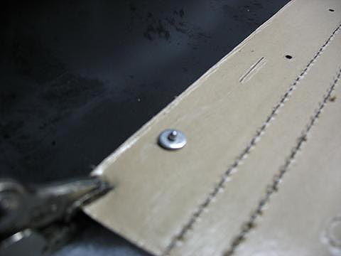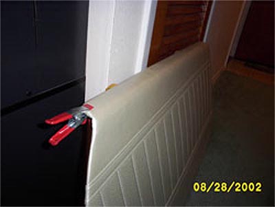 The last step is to spray your glue onto the backside of the metal strip, NOT THE FOAM!! The vinyl should stretch over the foam, eliminating any wrinkles or lumps. This step is kind of tricky. I stretched the vinyl over before gluing, and carefully trimmed the vinyl on the back of the panel so it would not overlap itself. Once you get to this point, youll see what I mean. You dont want 3 layers of vinyl or your panel wont fit flush on the door. Let the glue get real tacky, and once you stretch the vinyl and press it to the underside of the strip, it tends to slip back. I kept applying pressure to the vinyl as it was drying to make sure it was nice & tight. I also used clamps to hold it overnight.